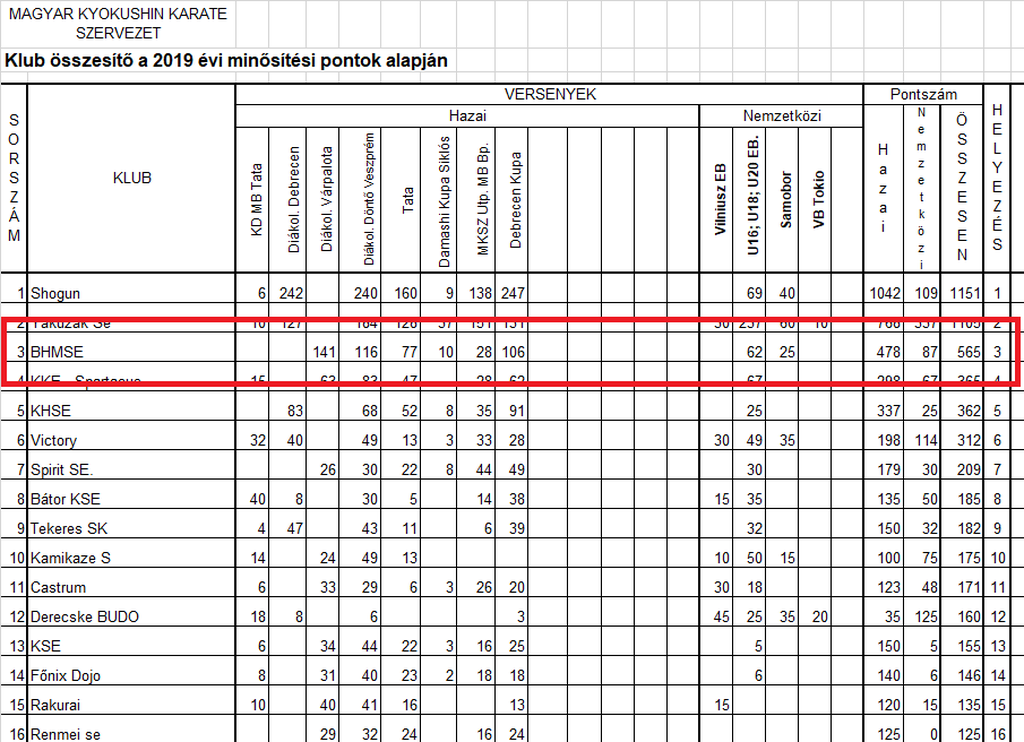 A Magyar Kyokushin Karate Szervezet versenyminősítő rendszere alapján, több, mint 50 egyesület közül a 2019. évi pontversenyt, a tavalyi évhez hasonlóan, a 3. helyen zártuk! Köszönjük tanítványaink munkáját, szüleik és támogatóink segítségét! A 2020-as évben hasonlóan szép sikereket szeretnénk elérni, melyekért folyamatosan dolgozunk.